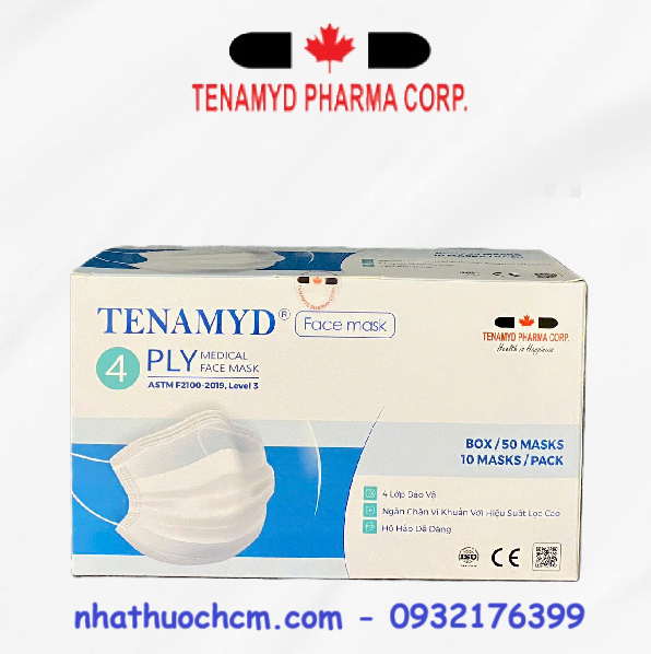 - Quy cách: mỗi hộp khẩu trang y tế Tenamyd có 50 cái, gồm 5 túi, mỗi túi 10 cái.