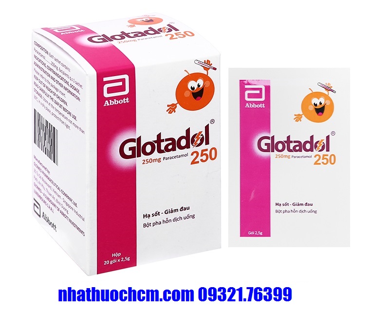 Mỗi hộp Thuốc giảm đau hạ sốt GLOTADOL 250mg gồm 20 gói.